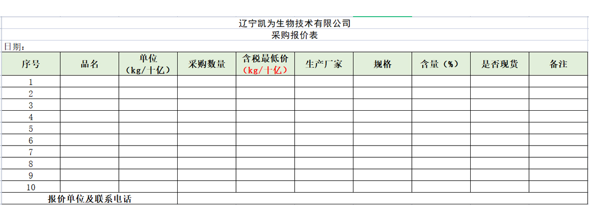 遼寧凱為生物技術有限公司采購報價表